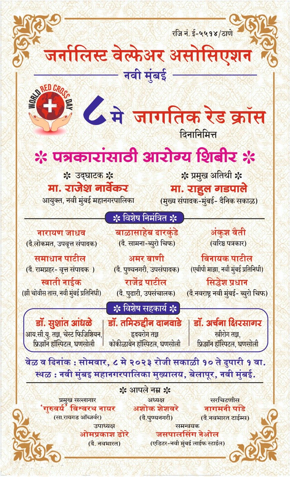 नवी मुंबई : 8 मई को विश्व रेड क्रॉस दिवस के अवसर पर पत्रकार वेल्फेअर संघ ने नवी मुंबई में पत्रकारों के लिए नि:शुल्क स्वास्थ्य जांच शिविर का आयोजन किया. शिविर नवी मुंबई नगर निगम मुख्यालय सेक्टर 15, बेलापुर में सुबह 10 बजे से दोपहर 1 बजे तक आयोजित किया जाएगा। कार्यक्रम का उद्घाटन अपर आयुक्त संजय काकड़े करेंगे और वरिष्ठ पत्रकार राहुल गढ़पाले मुख्य अतिथि होंगे. एसोसिएशन के अध्यक्ष अशोक शेषवारे ने बताया कि घनसोली स्थित फ्रीजन अस्पताल के डॉक्टर महिला और पुरुष पत्रकारों की जांच करेंगे।